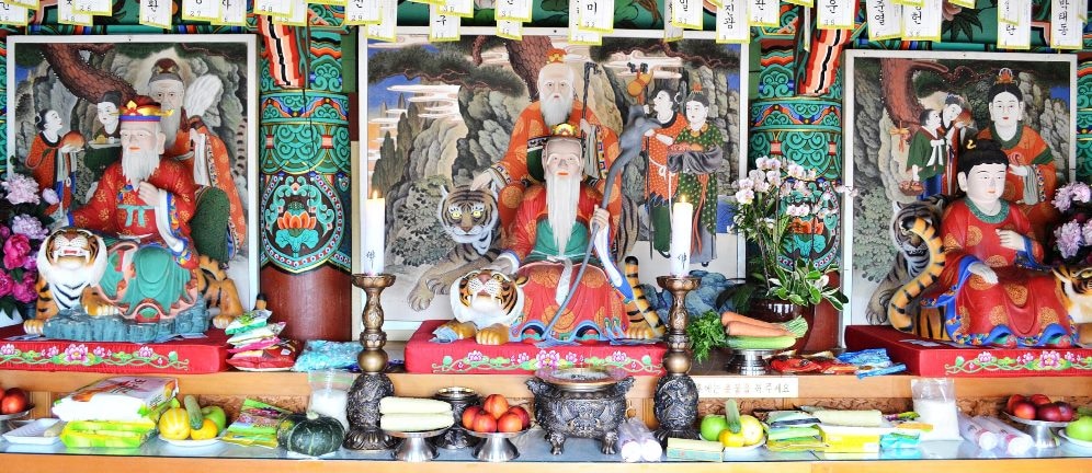 | THREE Sanshin altars with paintings and statues, two male and one female --unique! Might they represent the three major surrounding mountains, Baekdeok-san, Saja-san and Chiak-san...? |