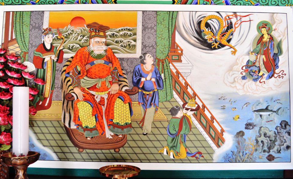 | The great Yong-wang Taenghwa [Dragon-King Altar-painting] inside. Unique in that it seems to be Munsu-bosal [Bodhisattva of Wisdom] riding in to visit on a Haetae mount instead of Gwanse-eum-bosal [Bodhisattva of Compassion] as is standard in these icons!! |