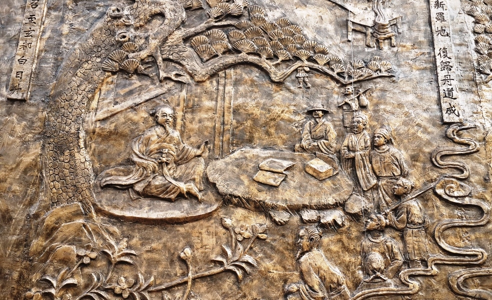 | The memorial biseok plaques: a full potrait of Kim Ga-gi, a proclamation of his historic significance as a realized "Immortal" in both Chinese and Korean, and on the left, a reproduction of the most famous "Diagram of the True Images of the Five Marchmounts" [五嶽真形圖, O-ak Jinhyeong-do in Korean]. |