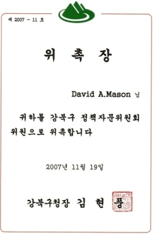 Appointment to the Gangbuk-gu (District of Seoul) Advisory Commission by its Mayor November 2007