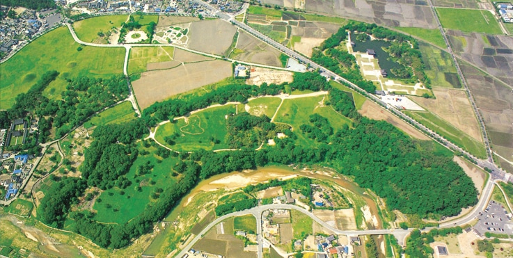 | The Banwol-seong [Half-Moon Castle] Palace-site, NW of Nak-san, just north of Nam-san's northern foothills, but across the Mun-cheon [Culture Shream] or Nam-cheon [South Stream] from them. The circular Cheomseong-dae Tower Site is seen in the upper-left, Anap-ji Pond at upper-right, and the Gyerim Royal Forest on the right side of the Palace. |