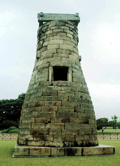 | Cheomseong-dae Astronomy Tower UNESCO: "The Cheomseongdae Astronomical Observatory in the Wolseong Palace Belt is the oldest existing astronomical observatory in Asia. Constructed from 632 to 647, it was used for observing the stars in order to forecast the weather. The stone observatory is a beautiful combination of straight lines and curves, and was designated as National Treasure #31 in 1962. Cheomseong-dae was built in a cylinder shape with stones. As many as 362 stones were piled up to make 27 levels. There is a square entrance and a space to hang a ladder, about 4 meters up from the ground. The inside is filled with soil up to the 12th level, and the 19th, 20th, 25th, and 26th levels all have long rocks hanging on two areas, shaped like the Chinese letter '井'. It stands over nine meters tall and the base stone on each side measures 5.35 meters. The four equinoxes, the two solstices and the 24 solar terms (also known as the astronomical solar year) were determined by the observation of stars. The pavilion stone is believed to have been used as a standard of deciding directions. The 362 stones used to build Cheomseong-dae represented the 362 days in a lunar year. |