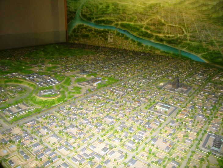 | Theoretical model of Gyeongju City at its classical peak around 800 CE -- with up to a million people living in the entire valley -- from standing on Nak-san (Mt. Nangsan) and looking towards the northwest. The great tower of Hwangryong-sa dominates the landscape on the upper-right, and that's Banwol-seong Palace on your left; the Buk-cheon [North Stream] is at top. |