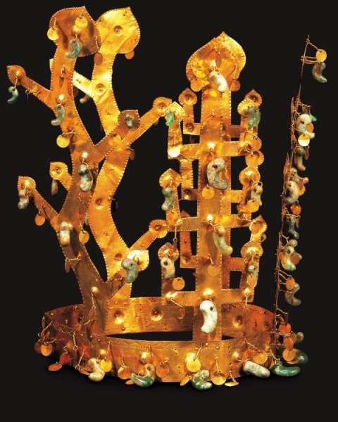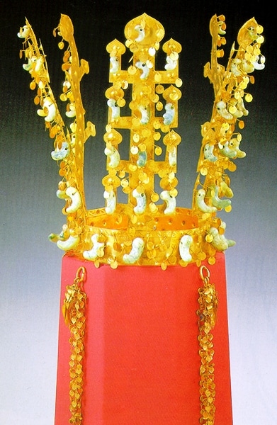 | Gold Crowns from King Beopheung's general era, found in royal tombs andnow in the Gyeongju National Museum. Emblems of a Shaman-King, they feature sacred birch trees and deer antlers, with cashew-shaped jades and gold bangles; Beopheung would likely have worn one like this, and there may well be one in his yet-unopened tomb. |