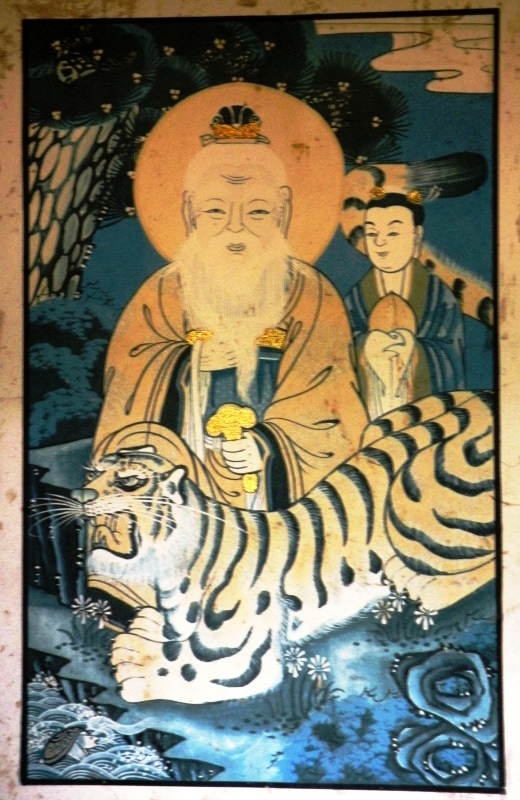 old Chilseong [Seven Stars of the Big Dipper painting, behind reflective glass, in the Main Hall the North and South Pole-Stars are depicted as mere officials, while the Il-wol-gwang Bosal [Sun-Moon Bodhisattvas] pair flanking Jeseok Buddha is especially prominent.