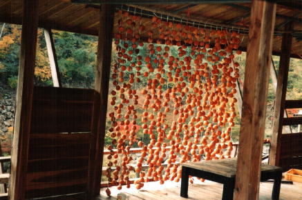 simple cabins here, as in the right photo, with drying persimmons.  A bit below the village there is a new