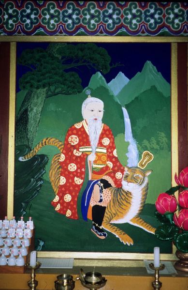 unique in Korea! In the San-shin painting, he sits on his tiger in a Mireuk-bul [Maitreya Bodhisattva] pose,