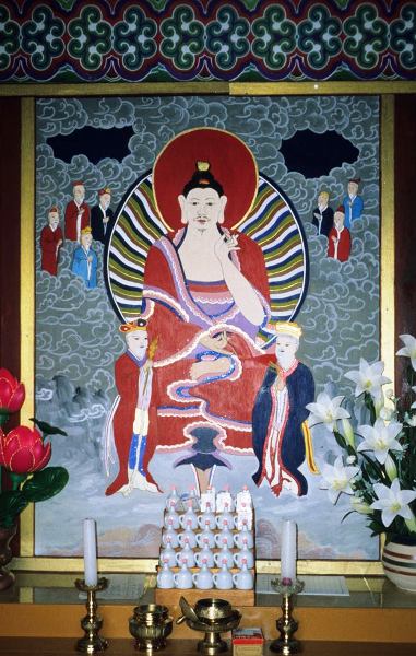 Korean-religion icons. On an altar in the Main Hall