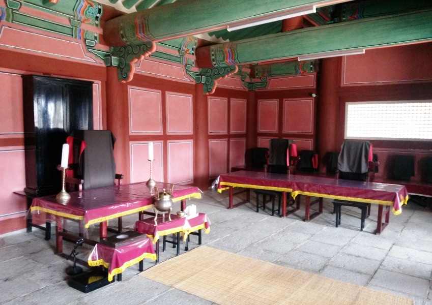 | Interior, with the main altars -- spirit-tablets covered when not in use. |