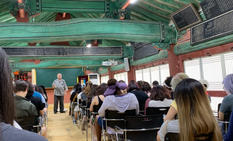 | 75 American college students visiting Korea (Yonsei U) through CIEE, listen to me explain Neo-Confucianism in the refurbished-floor old Lecture Hall, June 2019. |