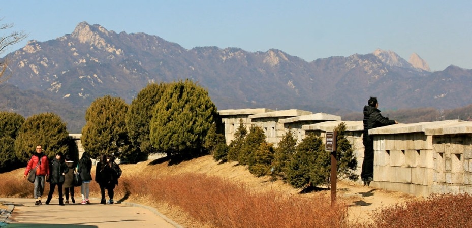 | The old Seoul City Wall that runs on the Nak-san ridge's crest from Bugak-san down to Dongdae-mun Gate has been nicely restored as a hiking-park. A great view is seen here of Samgak-san, from Hyeongje-bong on the left to Insu-bong on the right. |