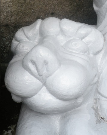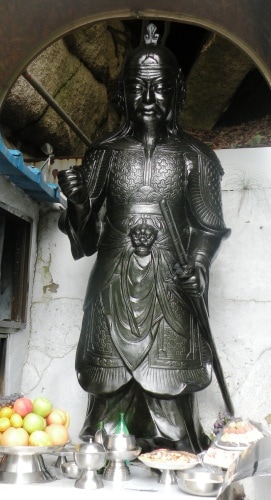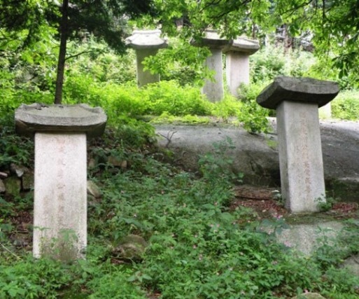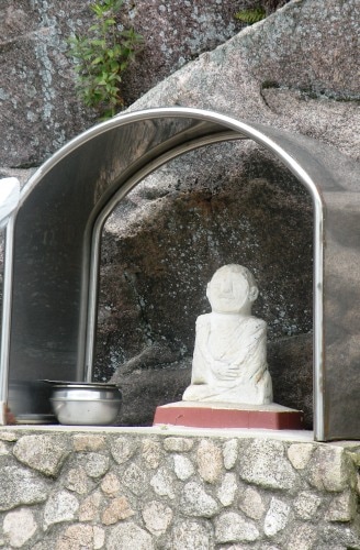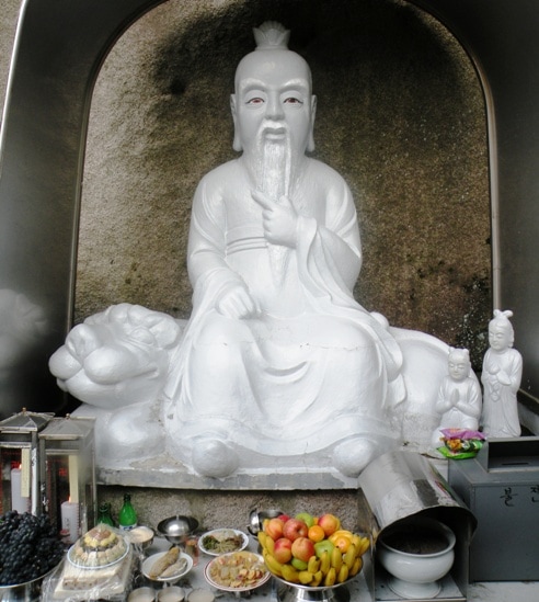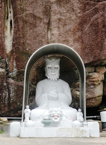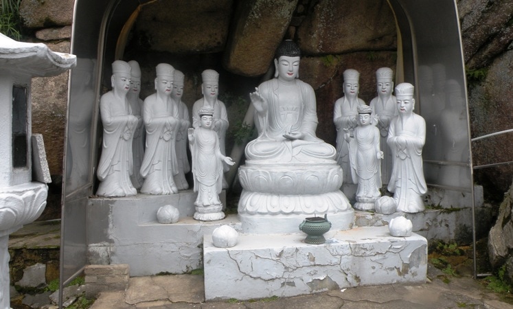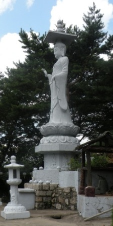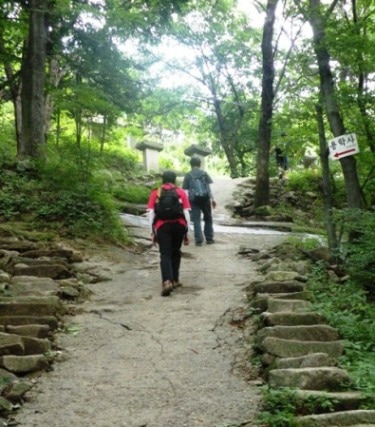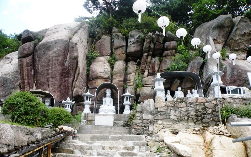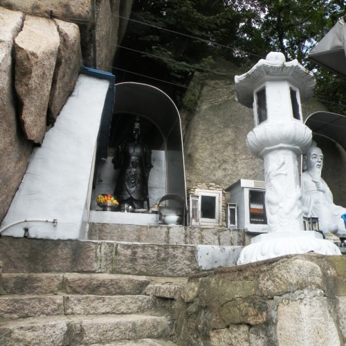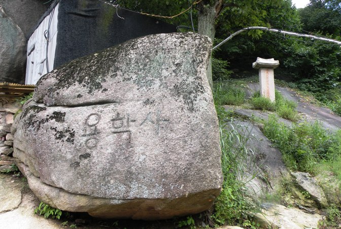 | Gate of the Bukhan-Sanseong [North-of-Han-River Mtn-Fortress], and only 50 meters north of Jungheung-saji in the scenic-gorge, on the west foot of Yongam-bong [Dragon-Rock Peak]. It was completely destroyed in the early 20th Century, but has now been rebuilt as a modern semi- shamanic devotional-temple with many stone statues dramatically set against the granite cliffs. Its name Yonghak-sa means "Dragon-Crane Temple", combining those two heaven-soaring auspicious symbol-creatures into an eum-yang (yin-yang) motif. |