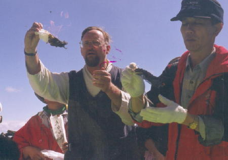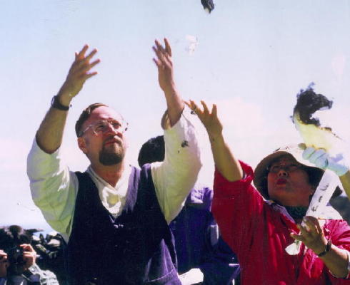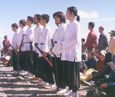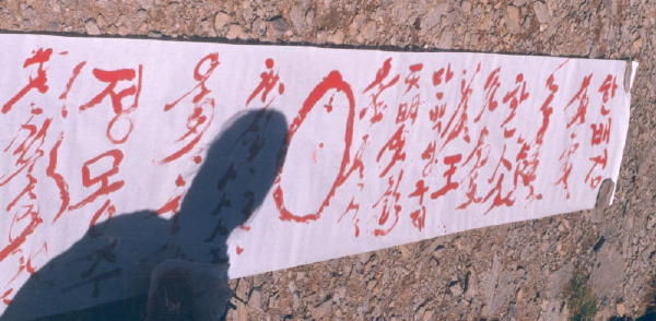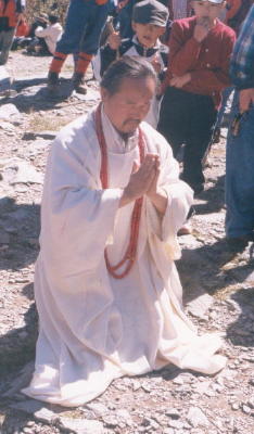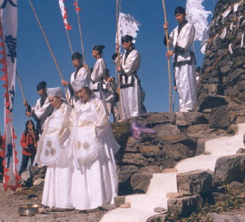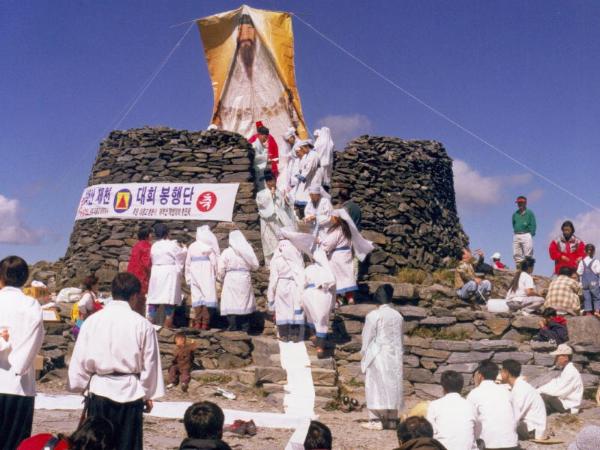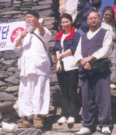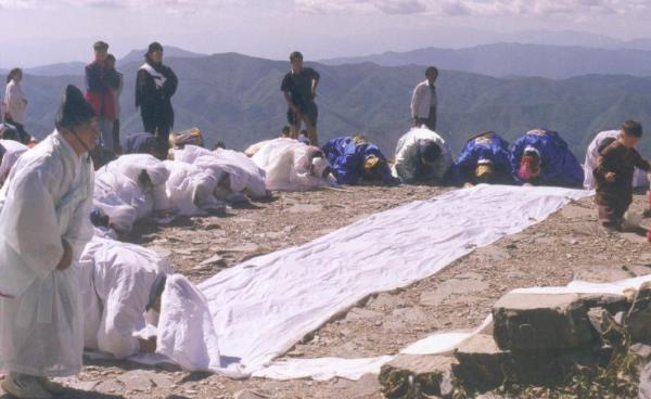 | Over 100 spectators, all Korean apart from me, joined dozens of officiants from Daecheongyo and a handful of photographers on Taebaek's Cheonje-dan Peak on the morning of Gyecheon-jeol 4332 (October 3rd 1999 by Western Calendar), to offer ritual-respect to the mythical founders of the first Korean Kingdom. I brought along 8 students from my Samguk-yusa Study Group at Yonsei University's Maeji Campus. |