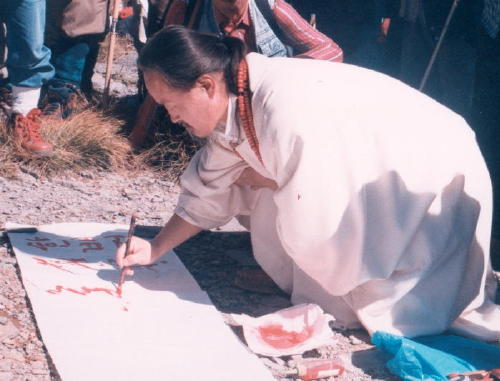 | On the shrine at the end of the ceremony, lighting a shamanic prayer-paper and releasing it as it floats up while burning -- I had written on it a wish for Korea's prosperity and reunification. |