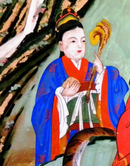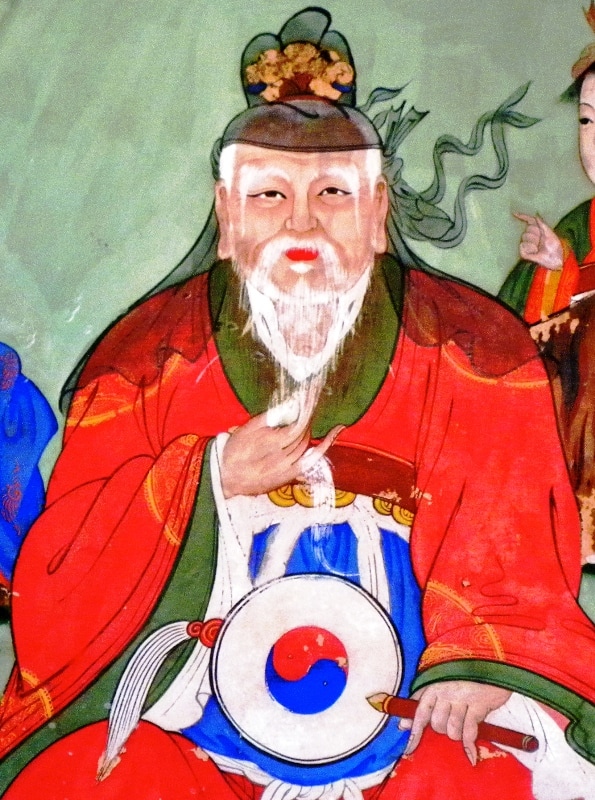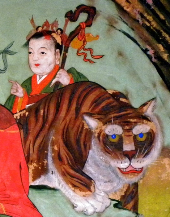 | In a rare but not unique case, the Mountain-spirit is holding a round paper fan with a Republic-of-Korea-style Taegeuk symbol on it, and a horse-tail fly-whisk (symbol of a seonsa meditation master) on it's end. |