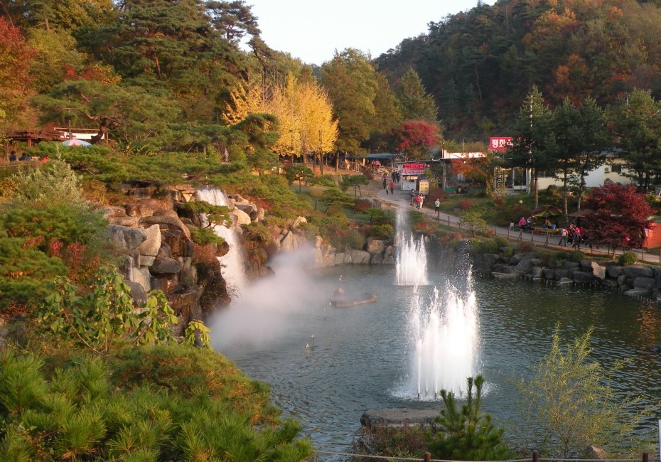 beautiful pond at the entranceway, below that Ilchul-mun Gate and above the parking lot