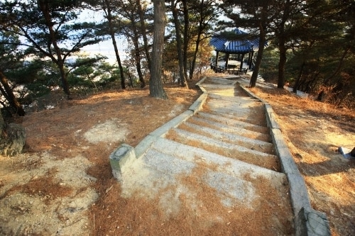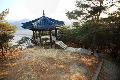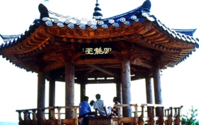 | This recently-built Hoeryong-dae Pavilion, near the 240-meter summit, has become a popular tourist-stop for viewing the Hoeryong-po Village. |
