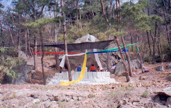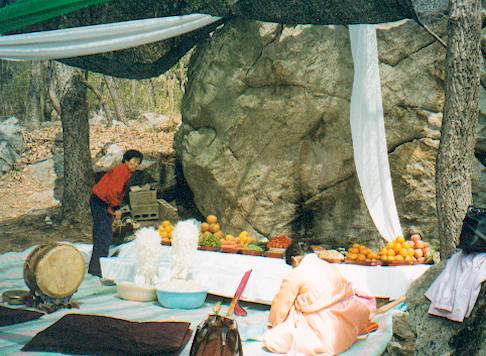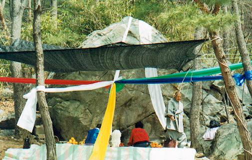 Live-action Mountain-worship going on at a boulder behind Bo-gwang-am [Treasure-Brightness Hermitage], which is